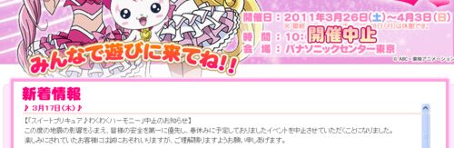 今日行った有明のほうにはパナソニックセンター東京と言う施設があるのだが、そこで行なわれることになっていたイベントも震災の影響で中止になっていた…のを今日知った。 *1 *1:http://www.mxtv.co.jp/event_precure/