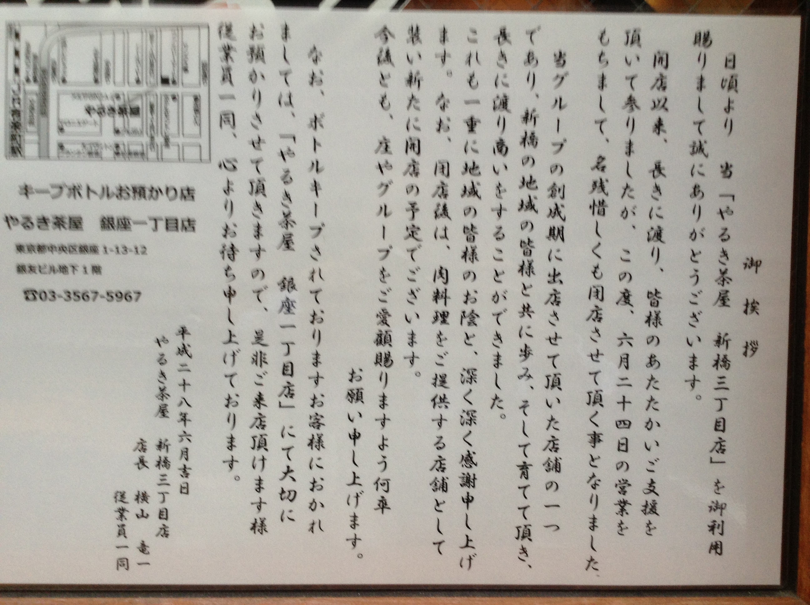 オリジナルサイズで見ないと読めないとは思うが、写真は昨日(6/25)訪ねた新橋のやるき茶屋が一昨日(6/24)までで閉店になっていたことを知らせる貼り紙。写真の位置情報を見られるなら「あぁ、あの店か」と分かる読者もいるかも?