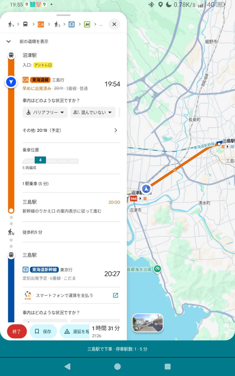 第2写真が、三島駅に着いた頃にリルートされたGoogleマップ。バスを使う提案よりも早い東海道線に乗って、ミニストップとプラスタでゆっくり買い物して、元の提案とおり20:27のこだま号に乗れた。